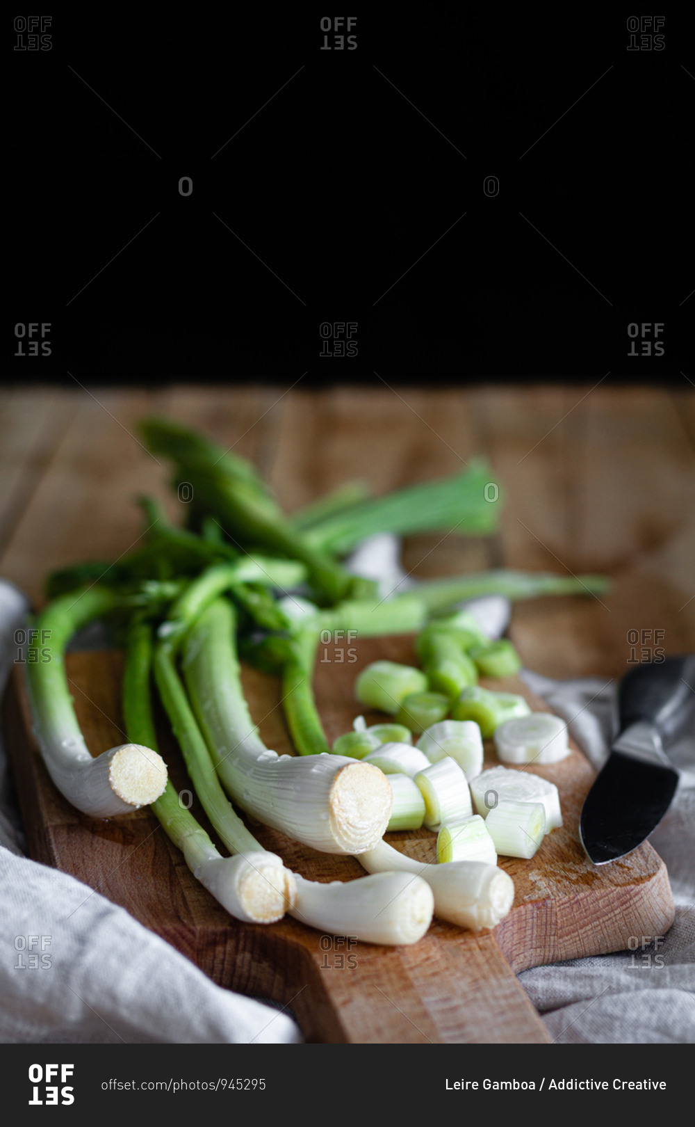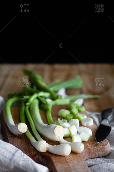 Bunch of ripe scallions placed on wooden cutting board and cloth napkin on rustic table in kitchen