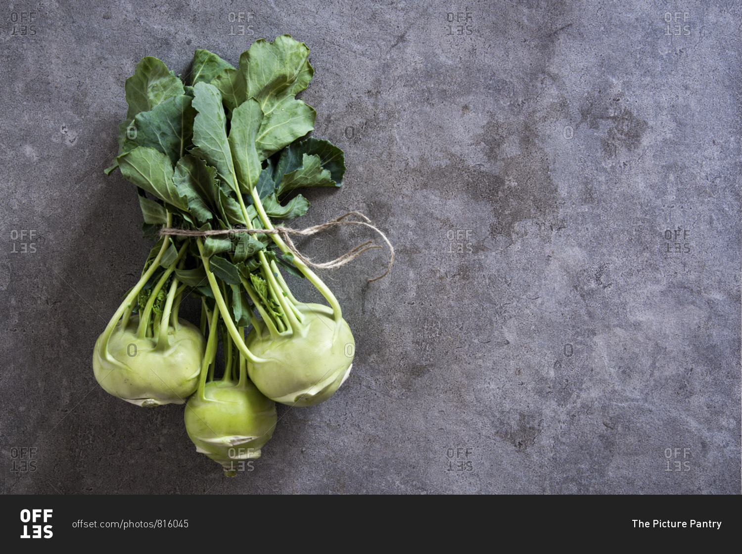 Bundle of fresh kohlrabi stems with leafs over grey concrete background