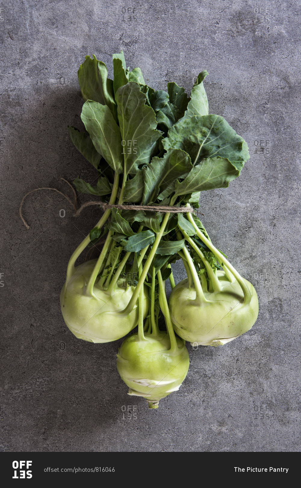 Bundle of fresh kohlrabi stems with leafs over grey concrete background