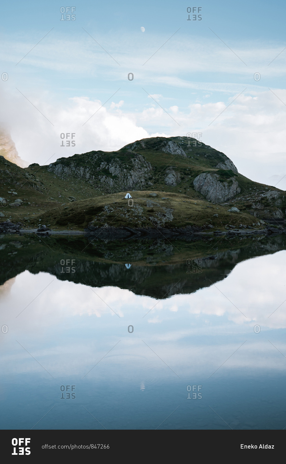 Calm water lake mirror reflection of the mountains on a foggy day