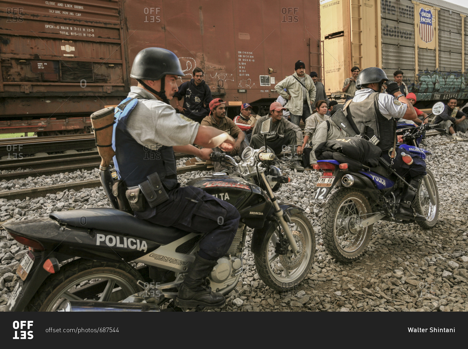 Celaya, Mexico - November 08, 2007: Armed police on motorbikes ride by group of migrants sitting on train tracks hoping to get to border with United States of America