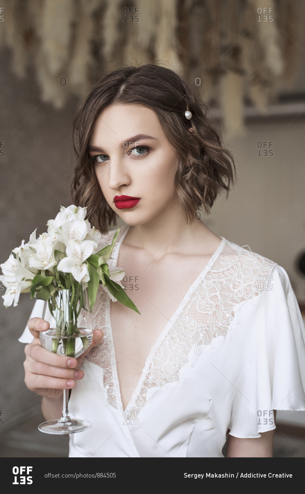 Charming modest lady in white dress with lace looking away and dreaming while holding glass with small white flowers and enjoying scent