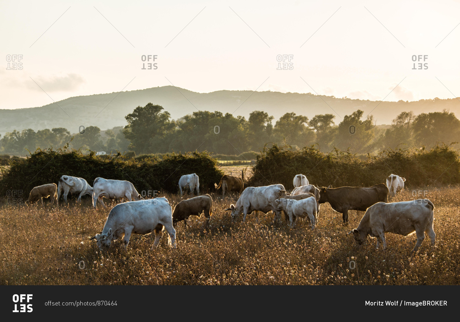 Charolais cattle in a pasture, evening light, Corsica, France, Europe