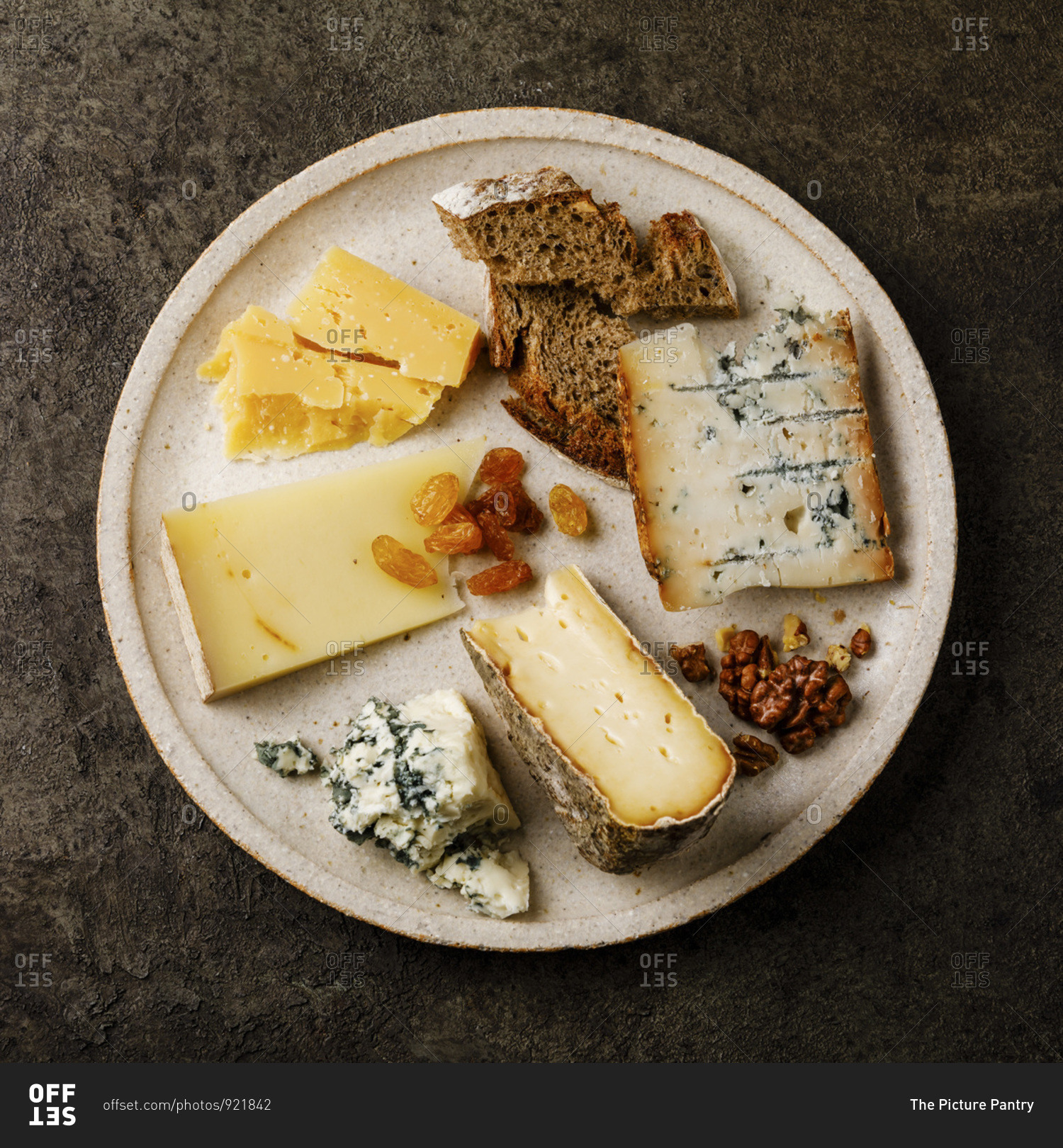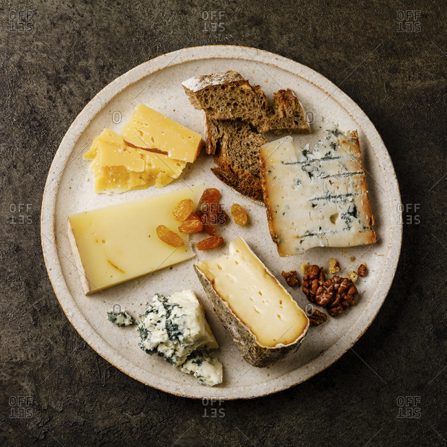 Cheese Plate with different types of cheese Snack assortment on dark background