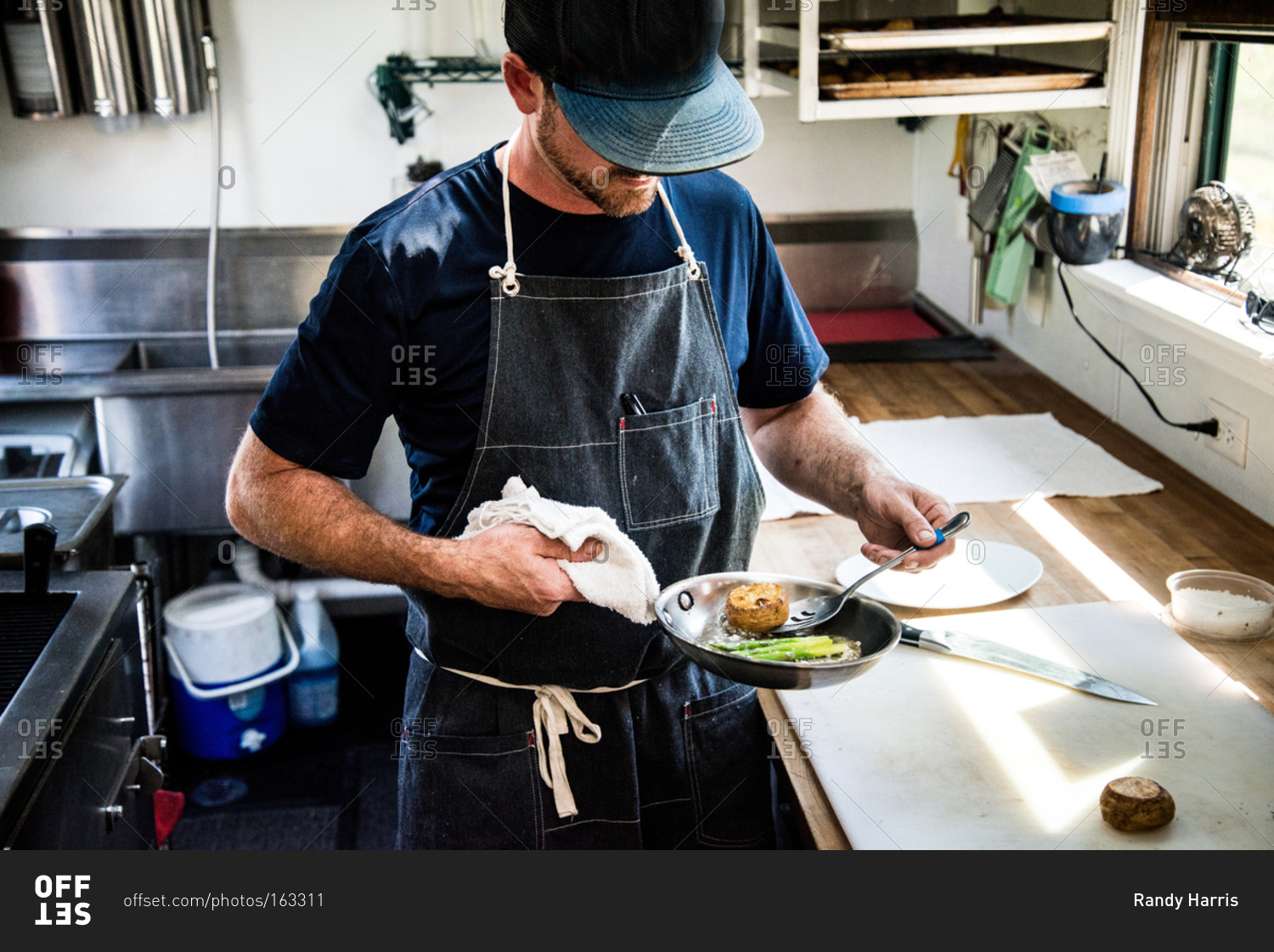 Chef preparing butter-poached lobster with asparagus and new potatoes
