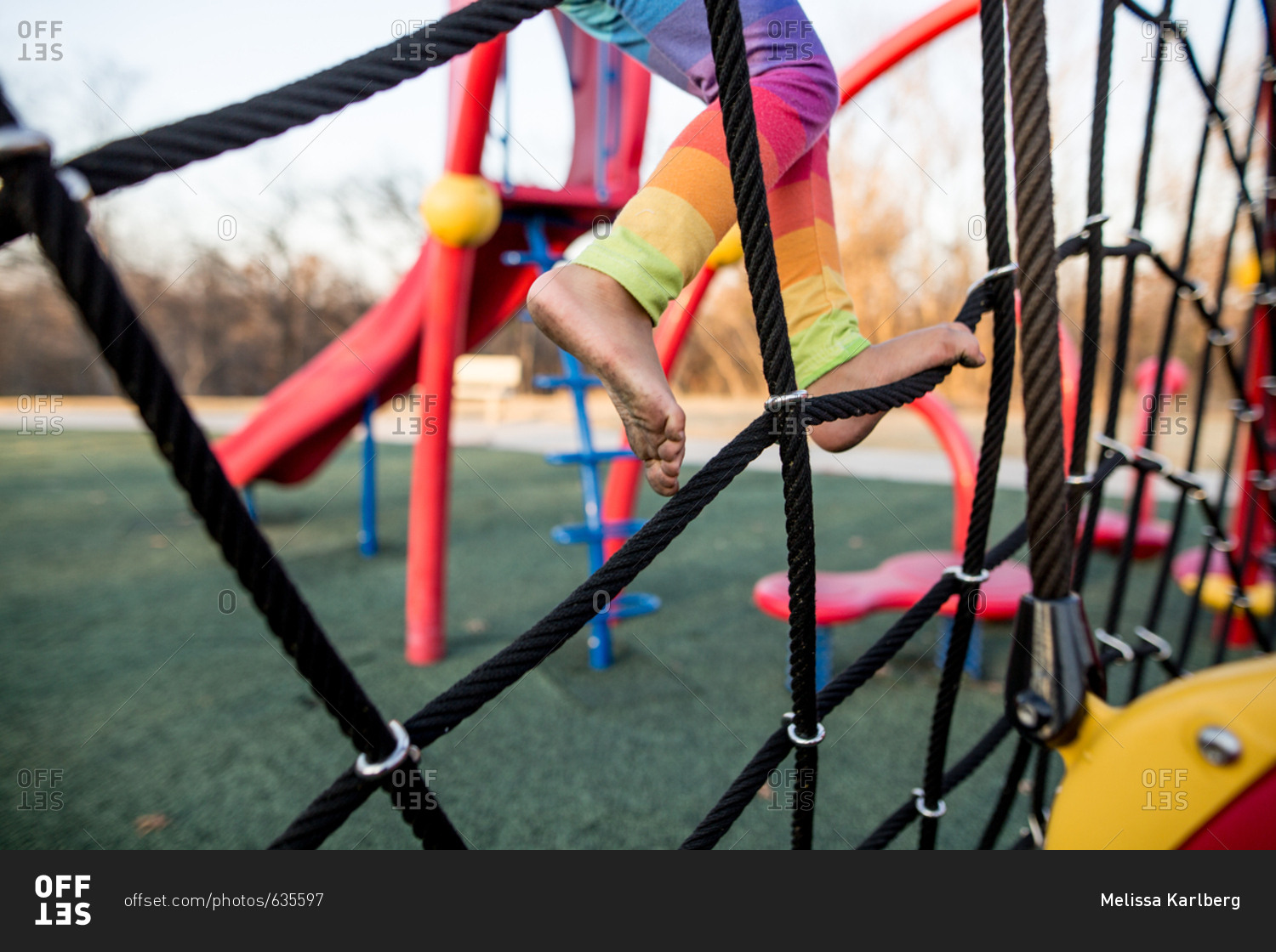 Child with dirty feet climbing rope structure at playground