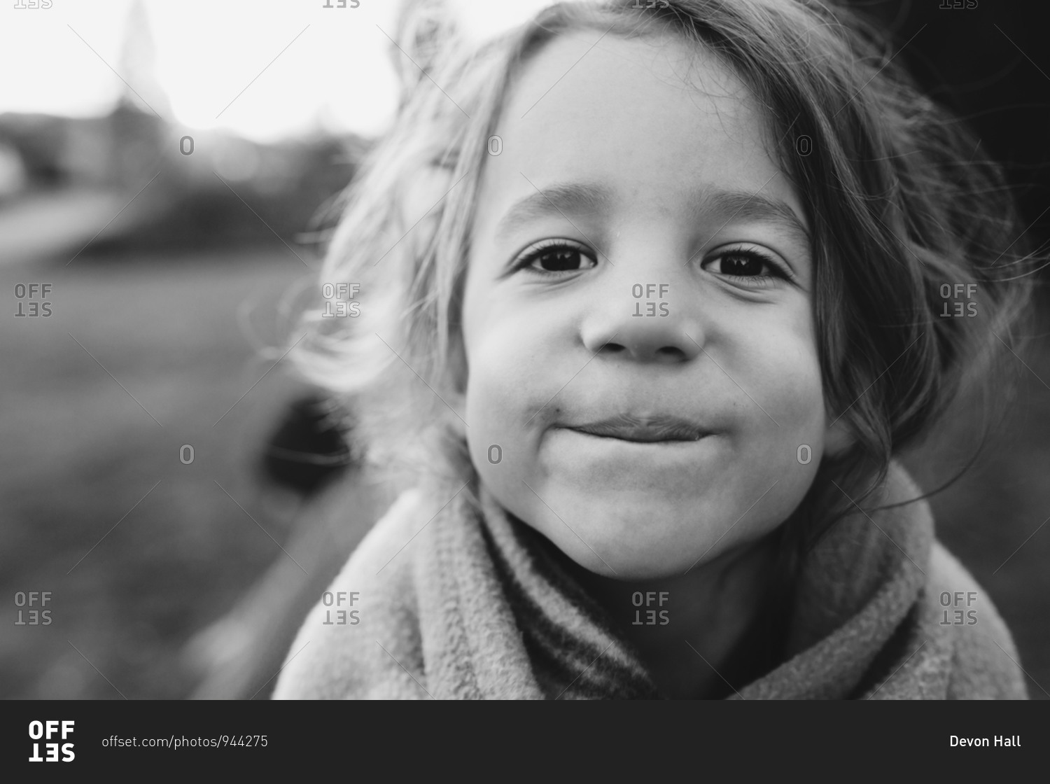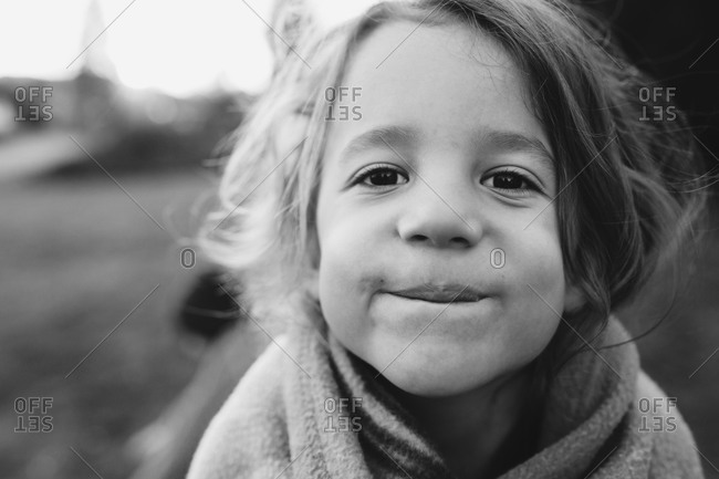 Close up of a happy boy with long wrapped in a blanket hair smiling