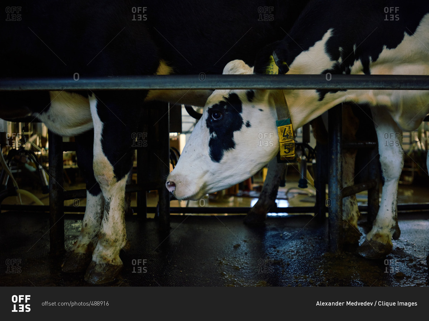 Close-up of black and white dairy cow standing in cowshed with other cattle and waiting for milking on automatic machine