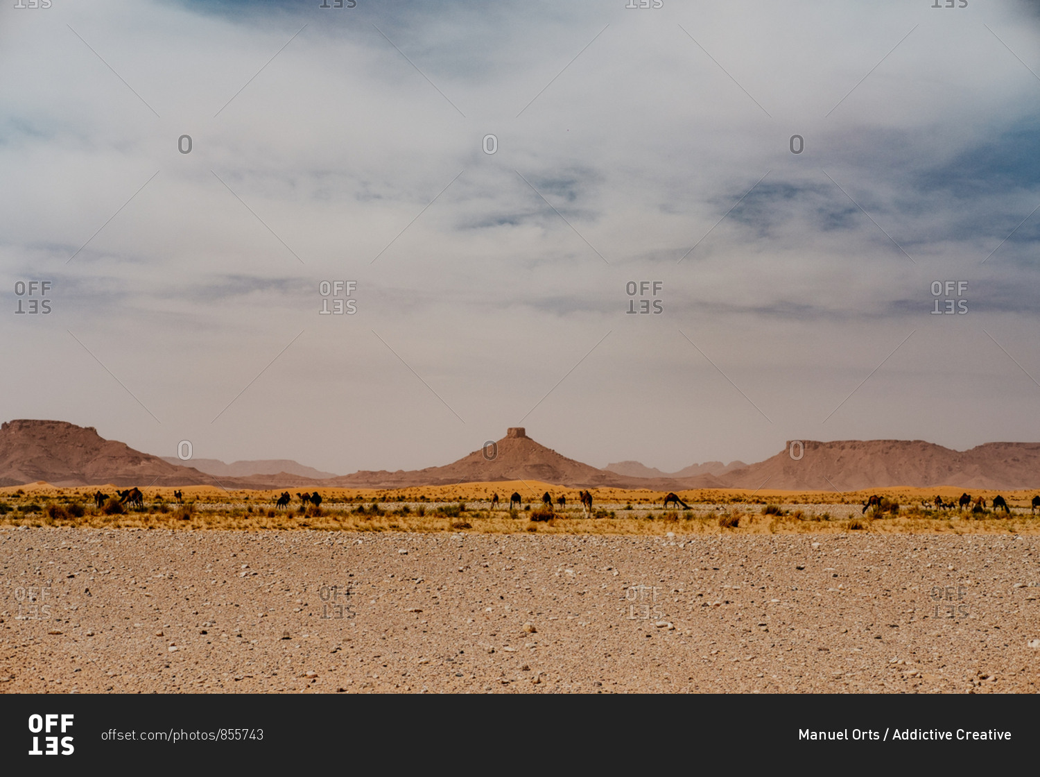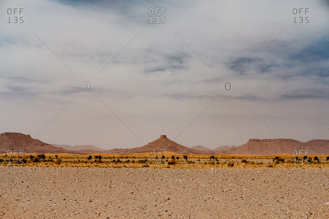 Cloudy sundown sky over hills and rocks in arid desert in evening in morocco