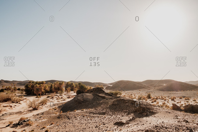 Cloudy sundown sky over hills and rocks in arid desert in evening in morocco