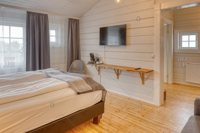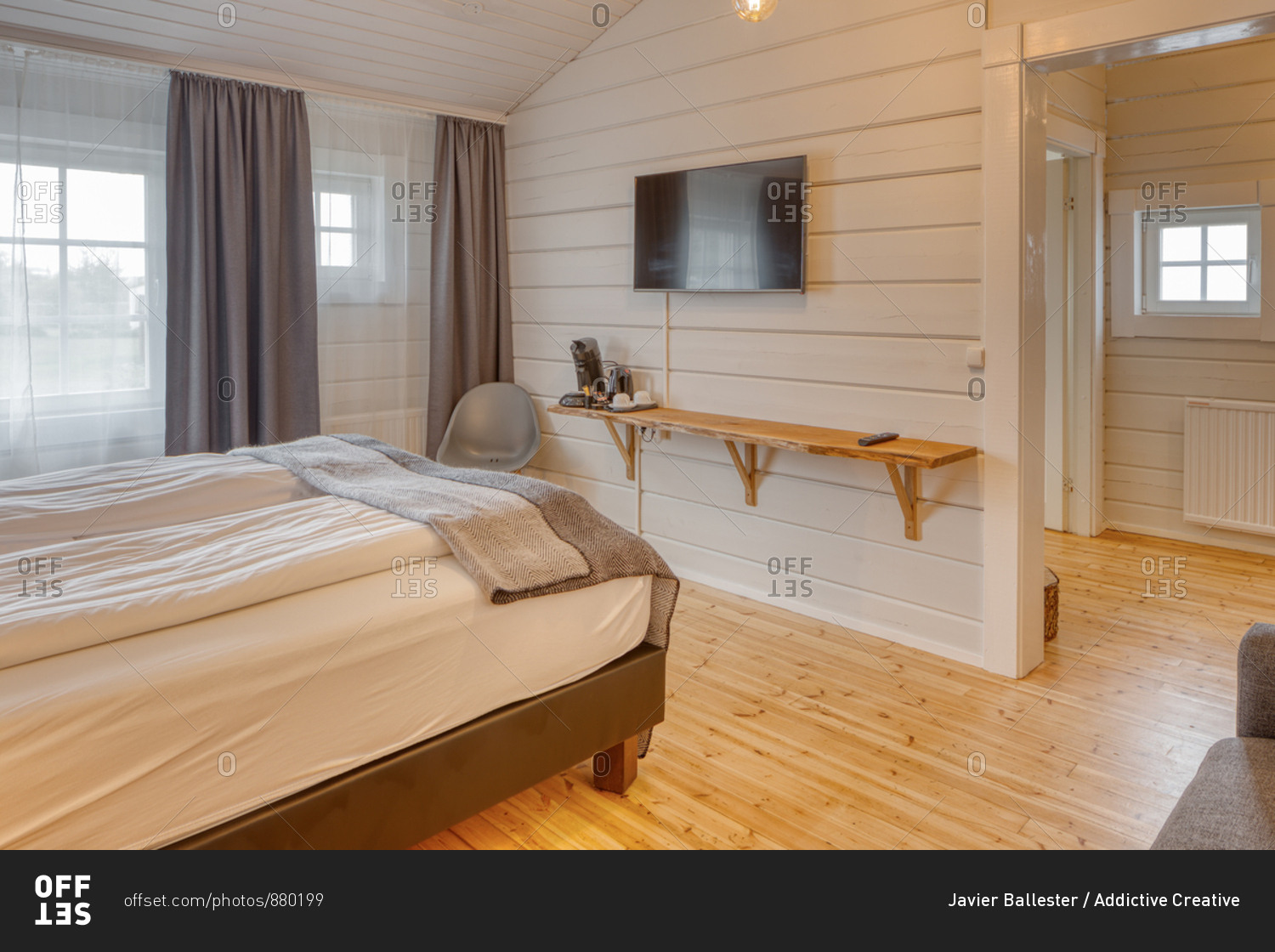 Comfortable bedroom with white wooden walls and big soft bed with cozy gray couch near burning floor lamp