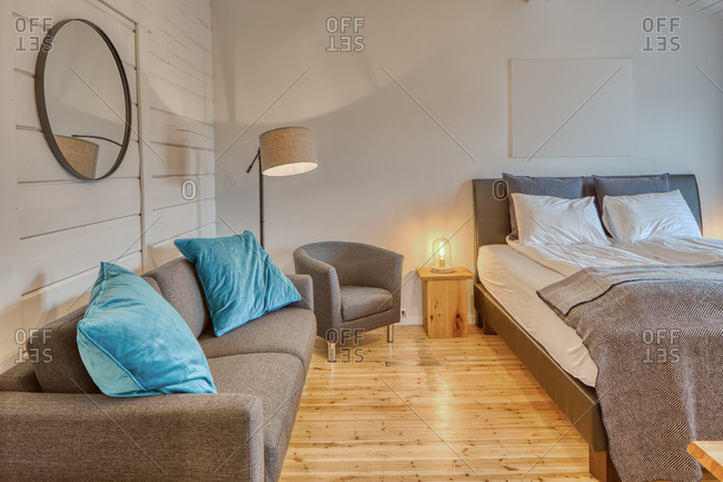 Comfortable bedroom with white wooden walls and big soft bed with cozy gray couch near burning floor lamp