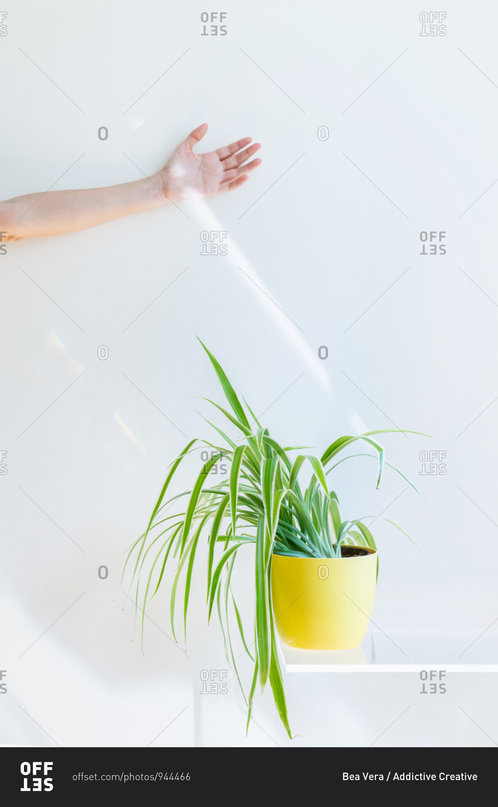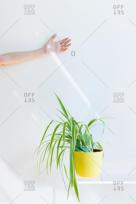 Conceptual beam of light touching an unrecognizable woman hand. Interior design and minimal florist concept.