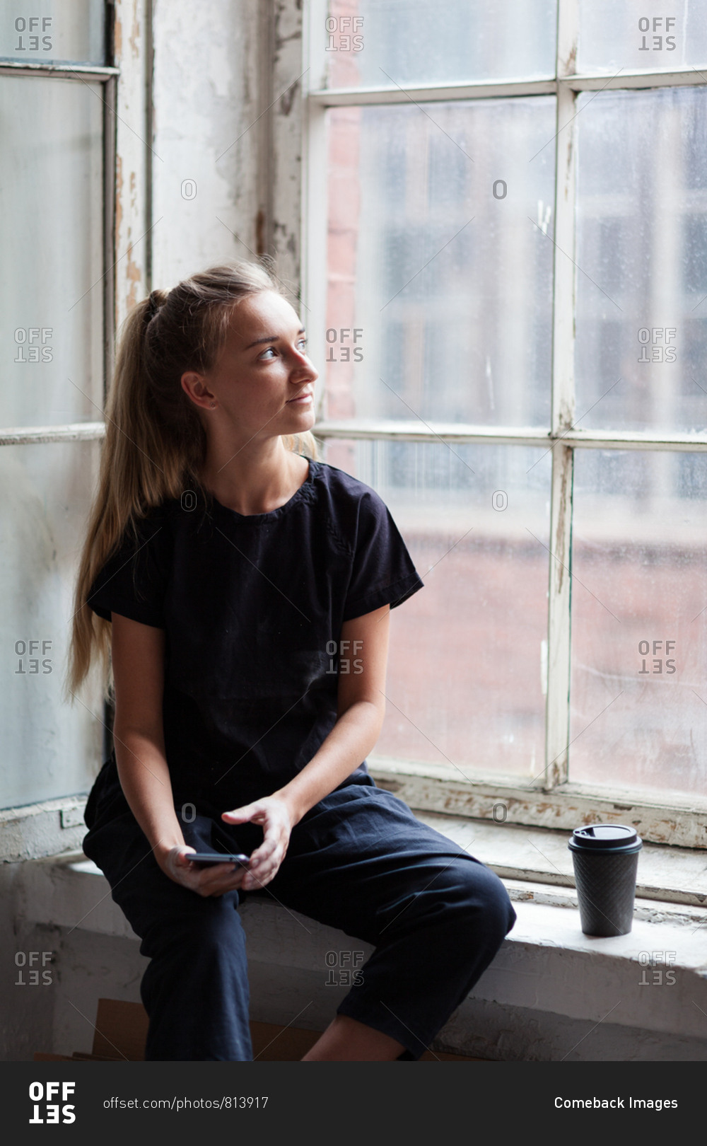 Creative young woman sitting on window sill with cell phone in her hand and looking through old dirty glass dreamily, paper cup of coffee placed nearby