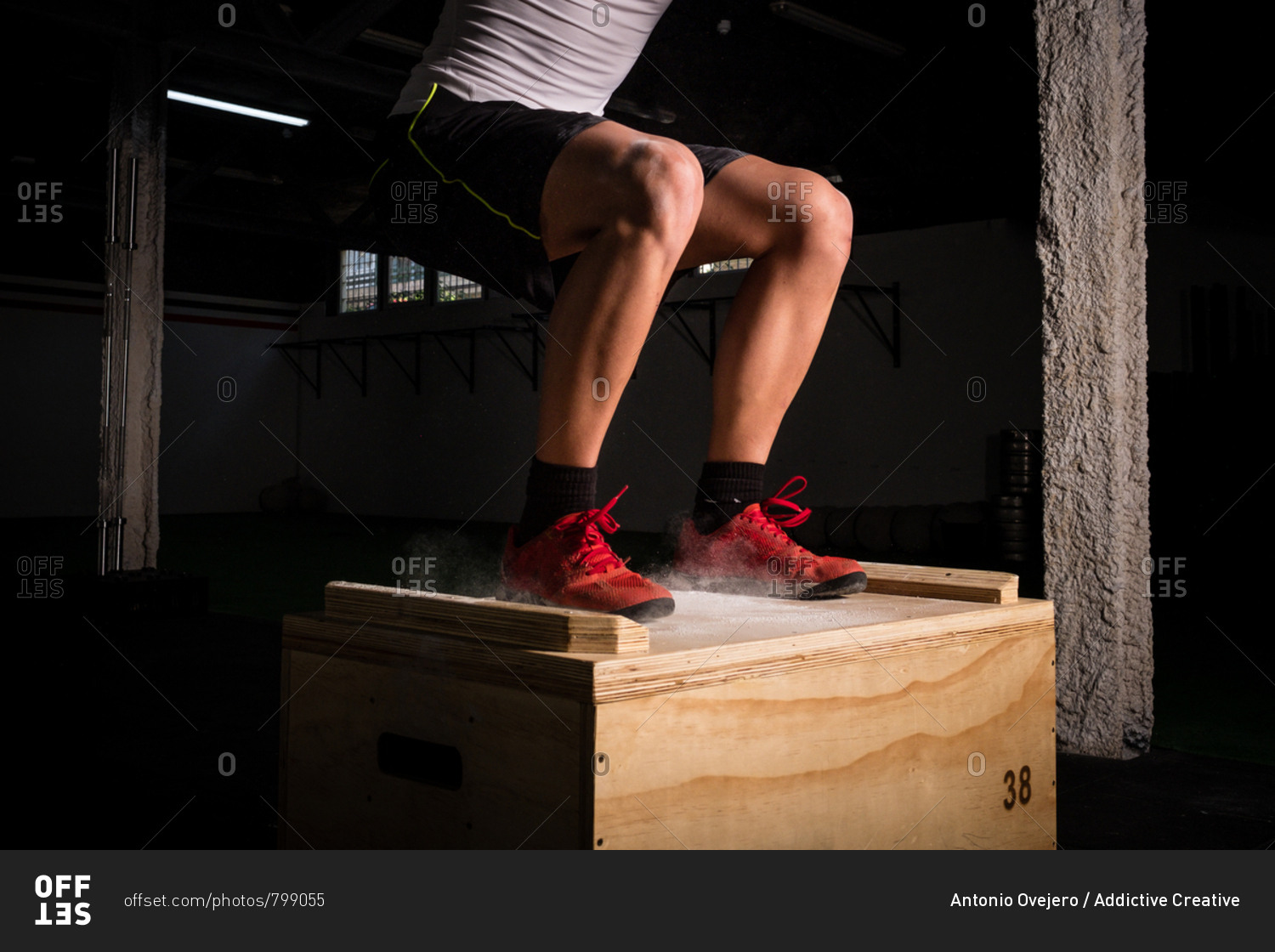 Crop athletic young guy in sportswear jumping on wooden box between chalk dust in gym