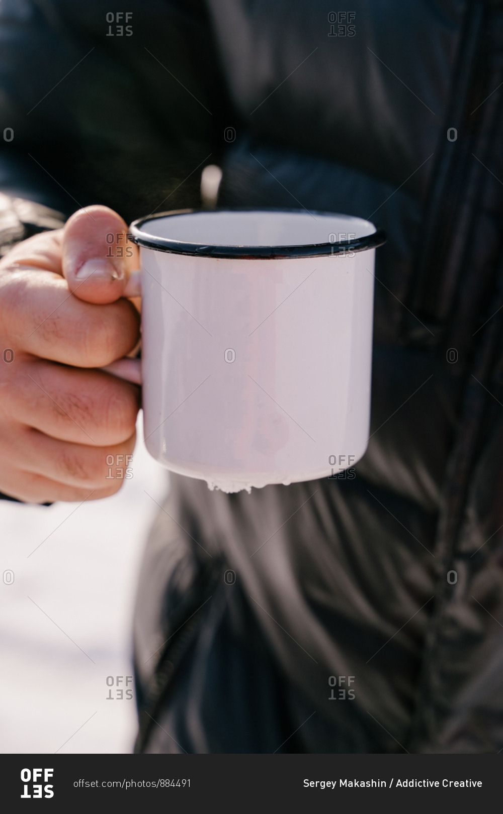 Crop male traveler in warm black jacket holding white enamel mug with hot tea while standing outdoors on winter day in Siberia