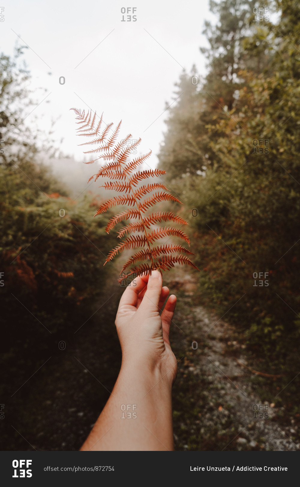 Crop unrecognizable person hand holding wilted orange huge leaf of ferns on background of trail under gray sky in foggy autumn dense forest during daytime