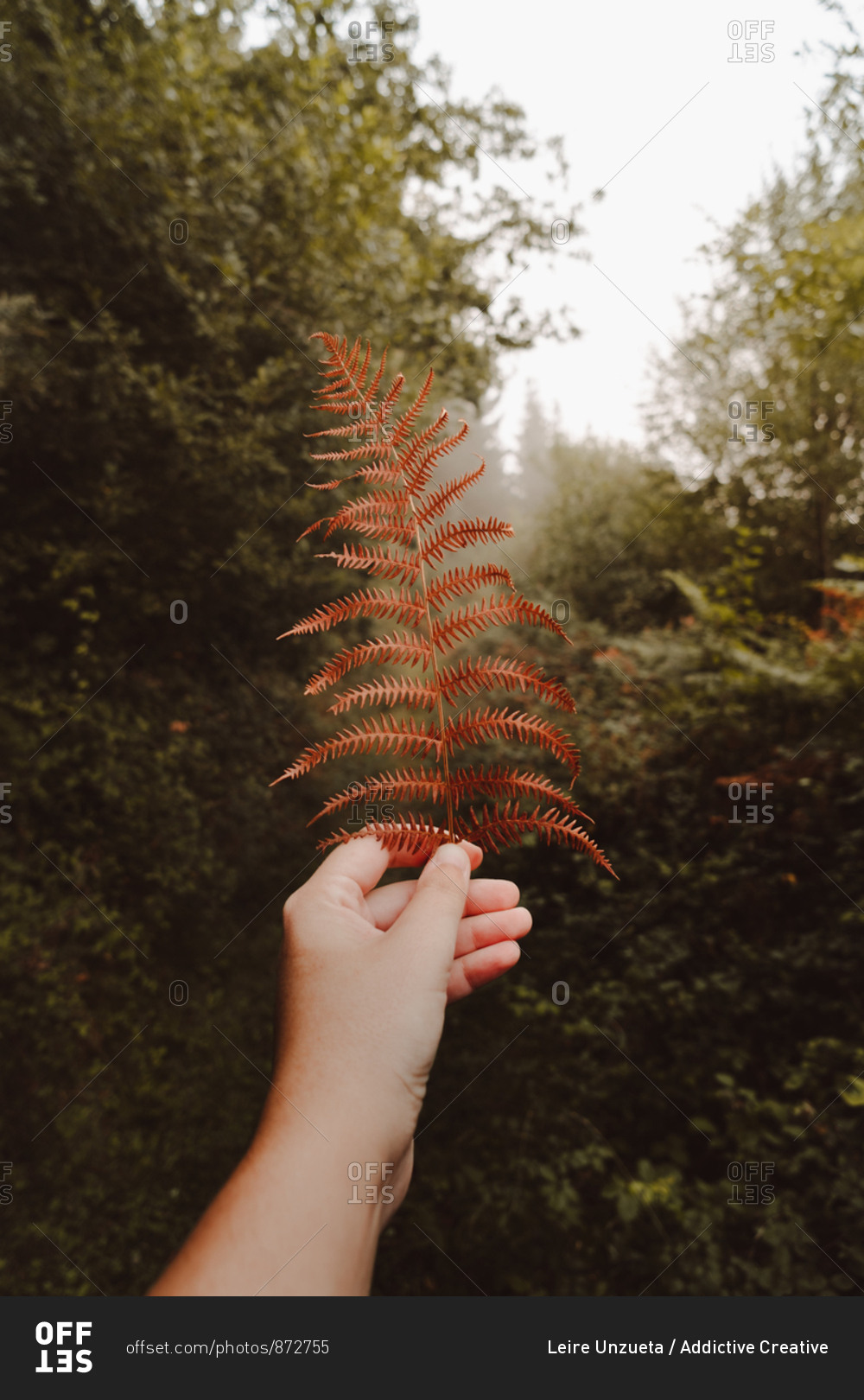 Crop unrecognizable person hand holding wilted orange huge leaf of ferns on background of trail under gray sky in foggy autumn dense forest during daytime