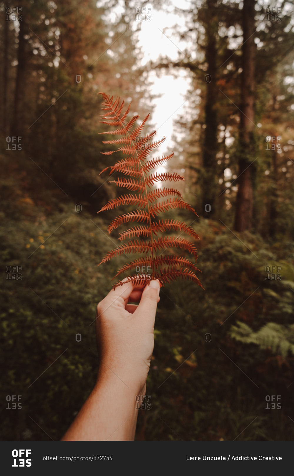 Crop unrecognizable person hand holding wilted orange huge leaf of ferns on background of trail under gray sky in foggy autumn dense forest during daytime