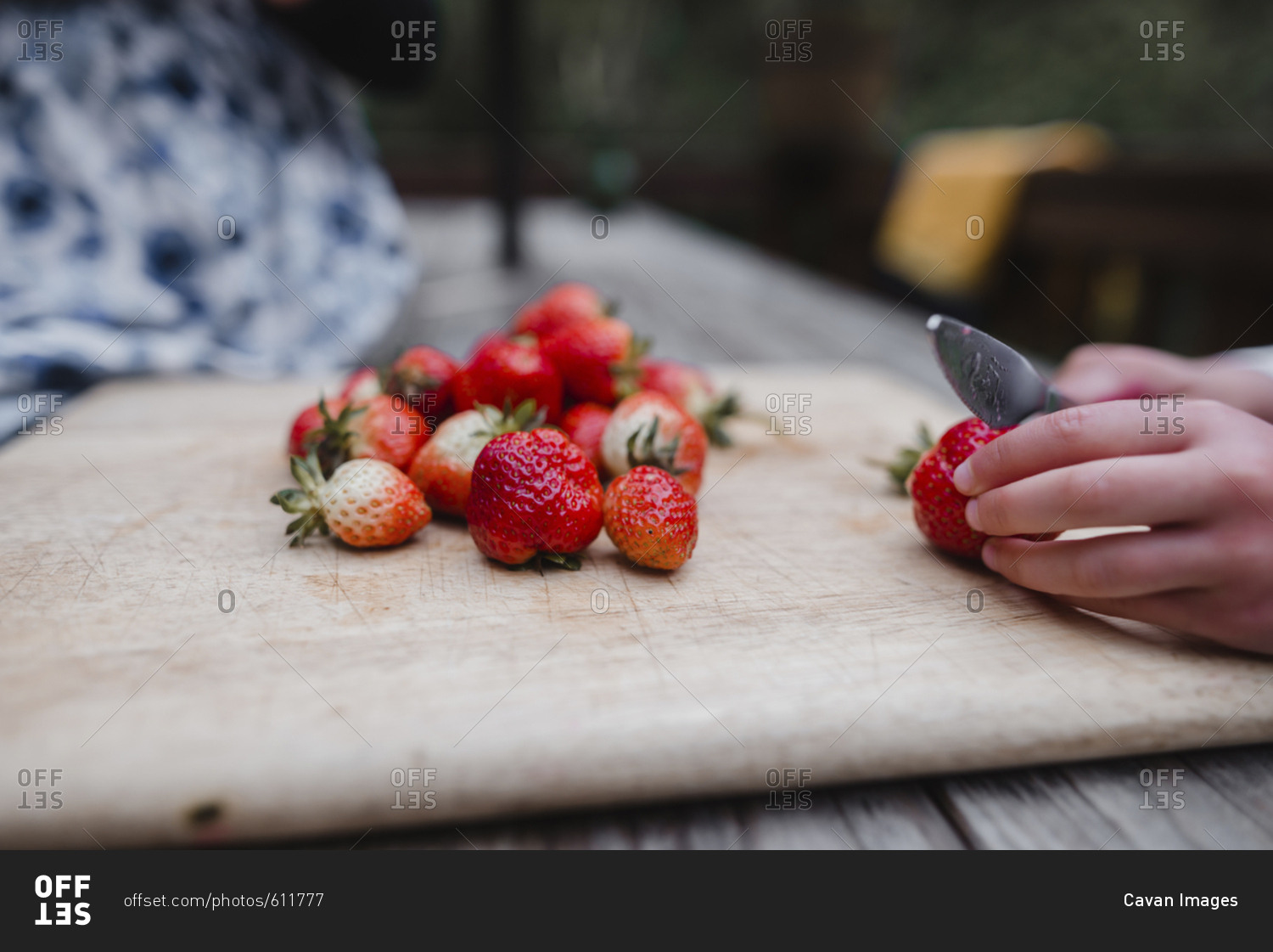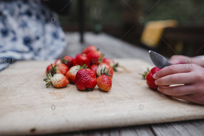 Cropped hands of girl cutting strawberry on cutting board at table