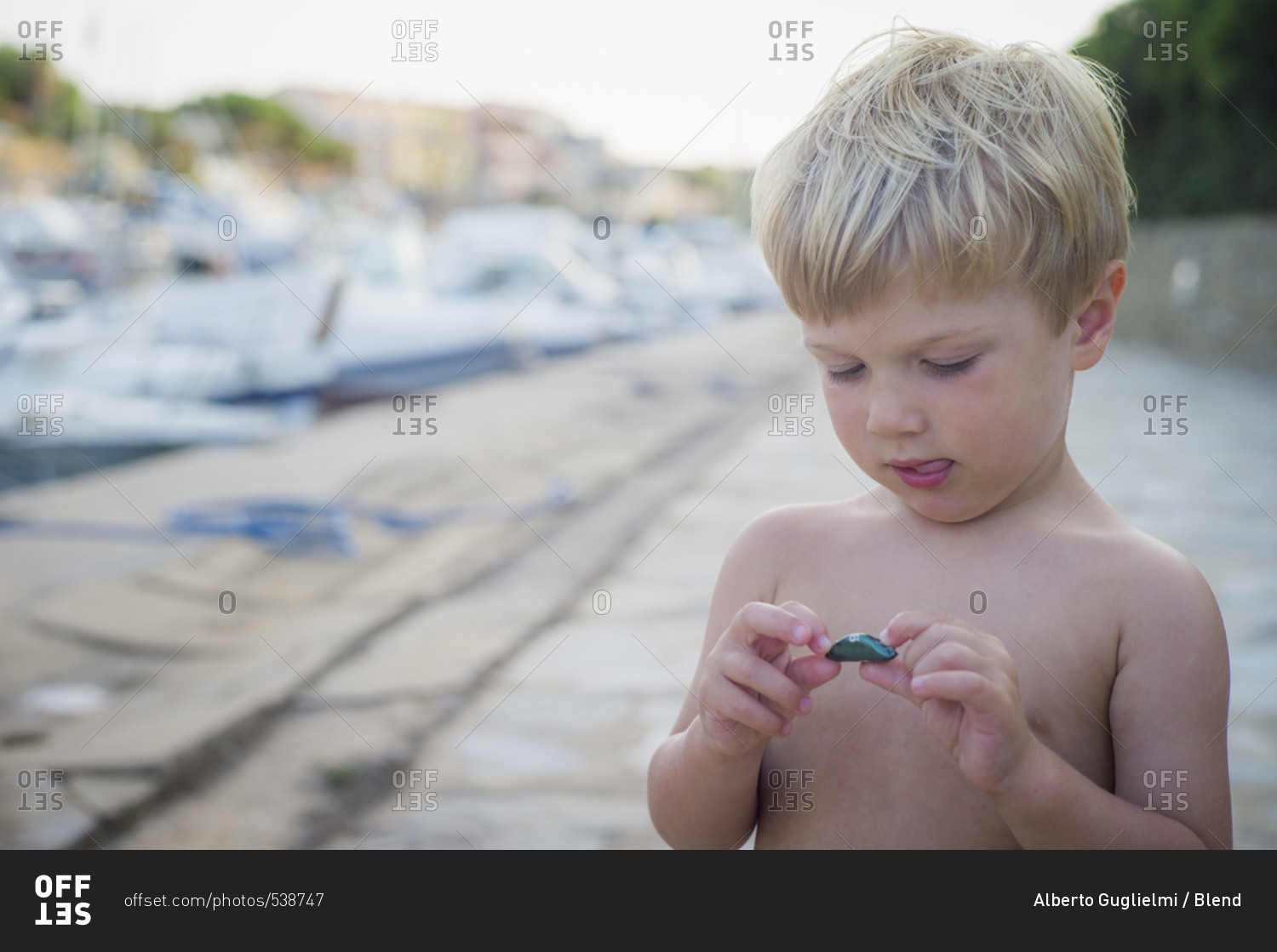 Curious Caucasian boy playing with rock