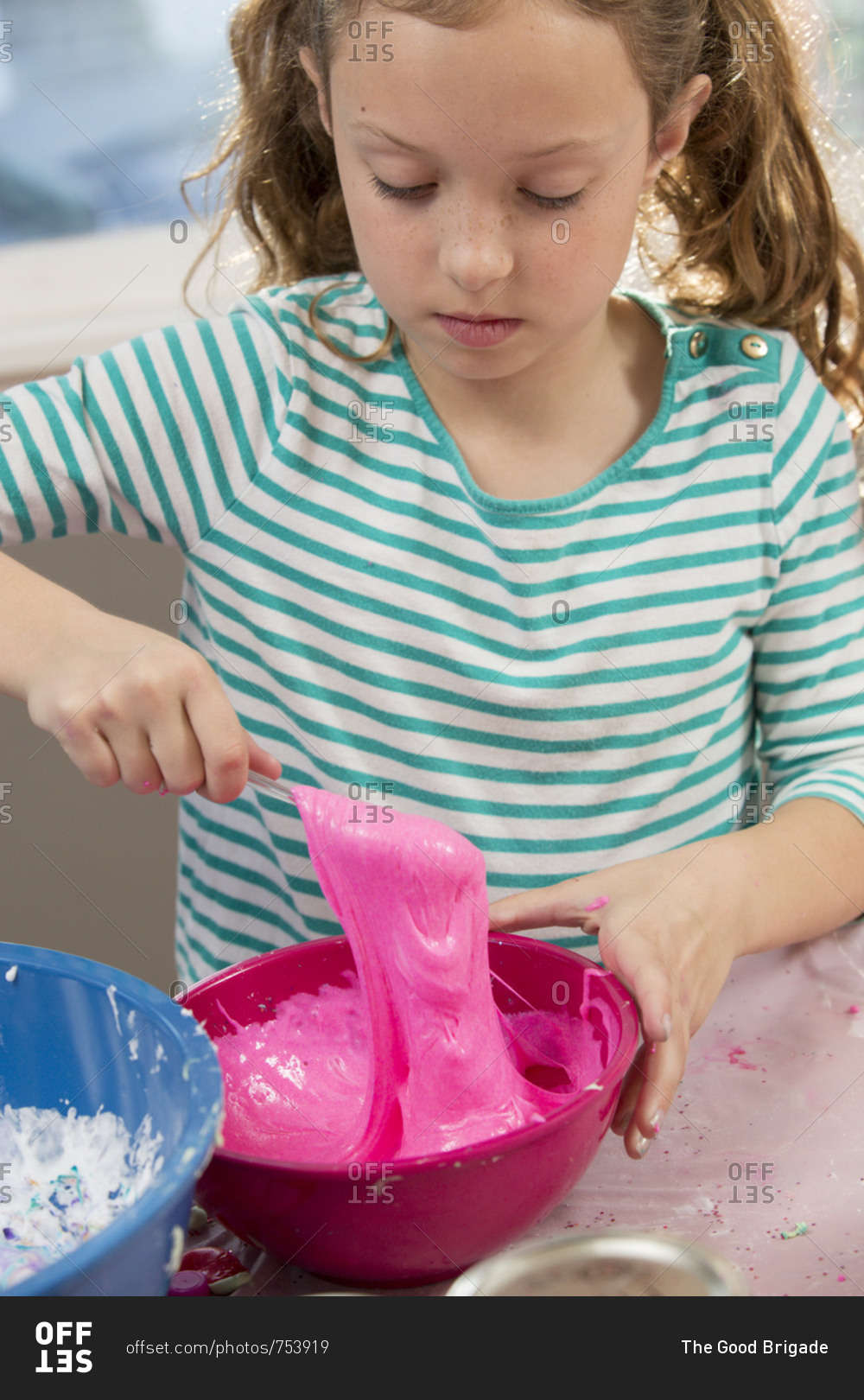 Cute girl mixing pink glitter slime with spoon in bowl at home