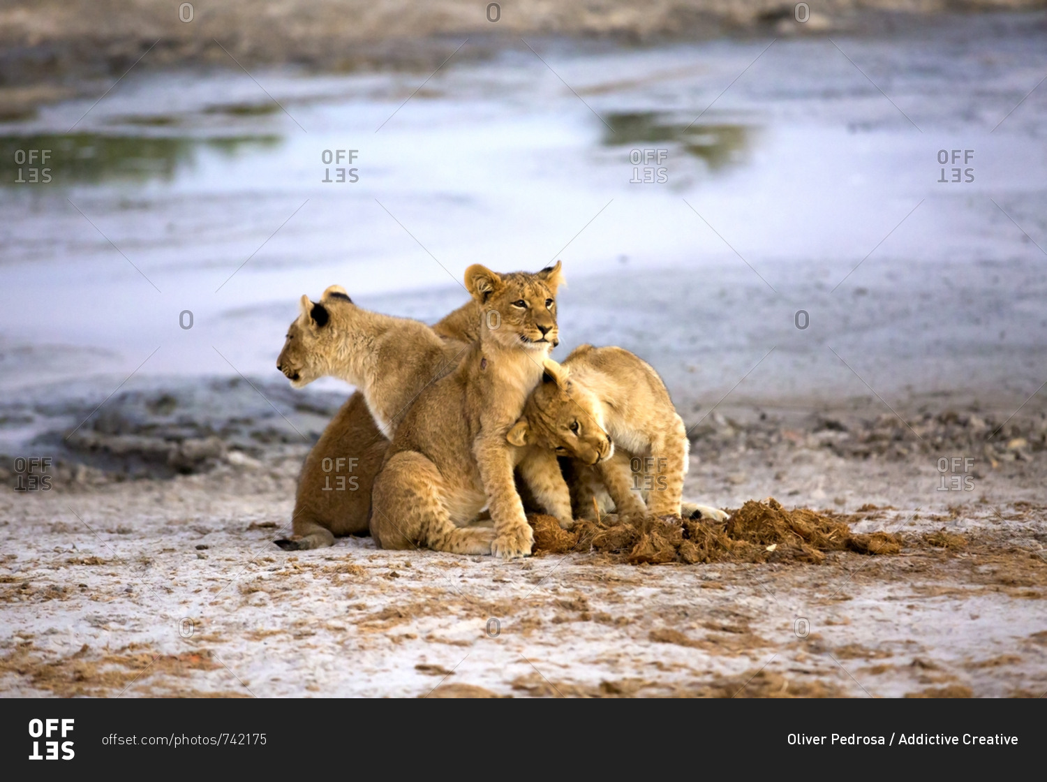 Cute lion cubs near pond