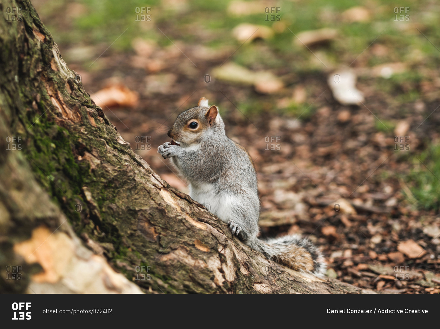Cute squirrel sitting on dry leaves on lawn in calm autumn park in London