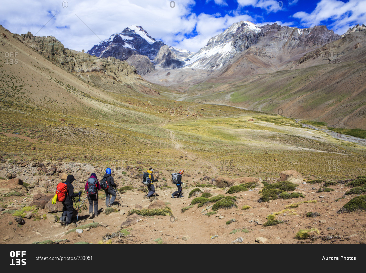 December 31, 2017: Mountaineers approaching Aconcagua Base Camp, Plaza de Argentina, Mendoza, Argentina