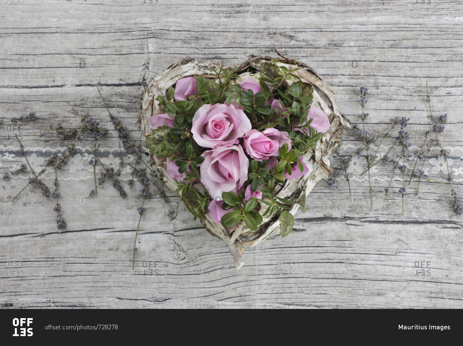 Decoration, heart with roses and lavender blossoms, vintage,