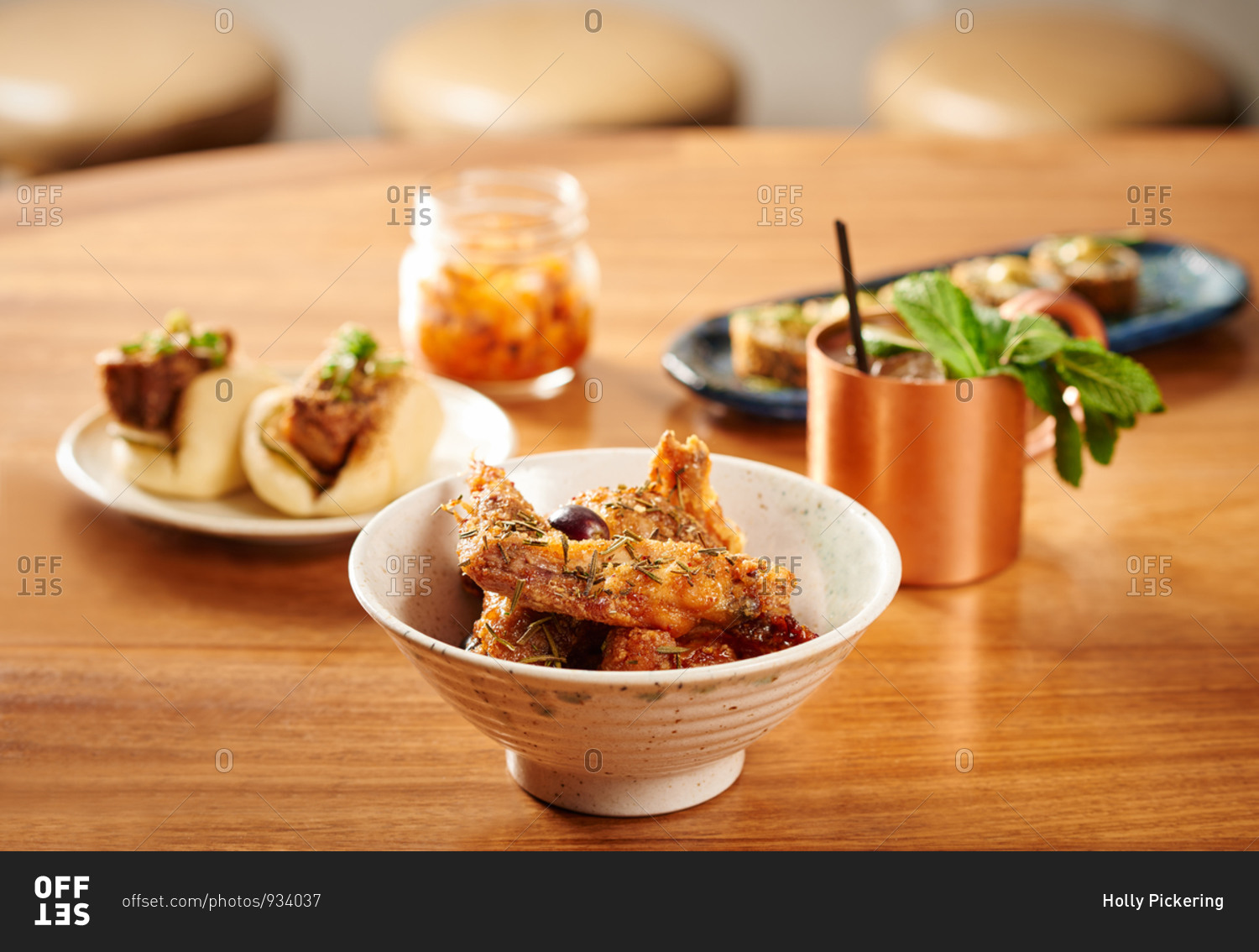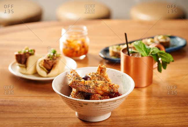 Deep fried aubergine with rosemary and grapes in a modern Korean BBQ restaurant
