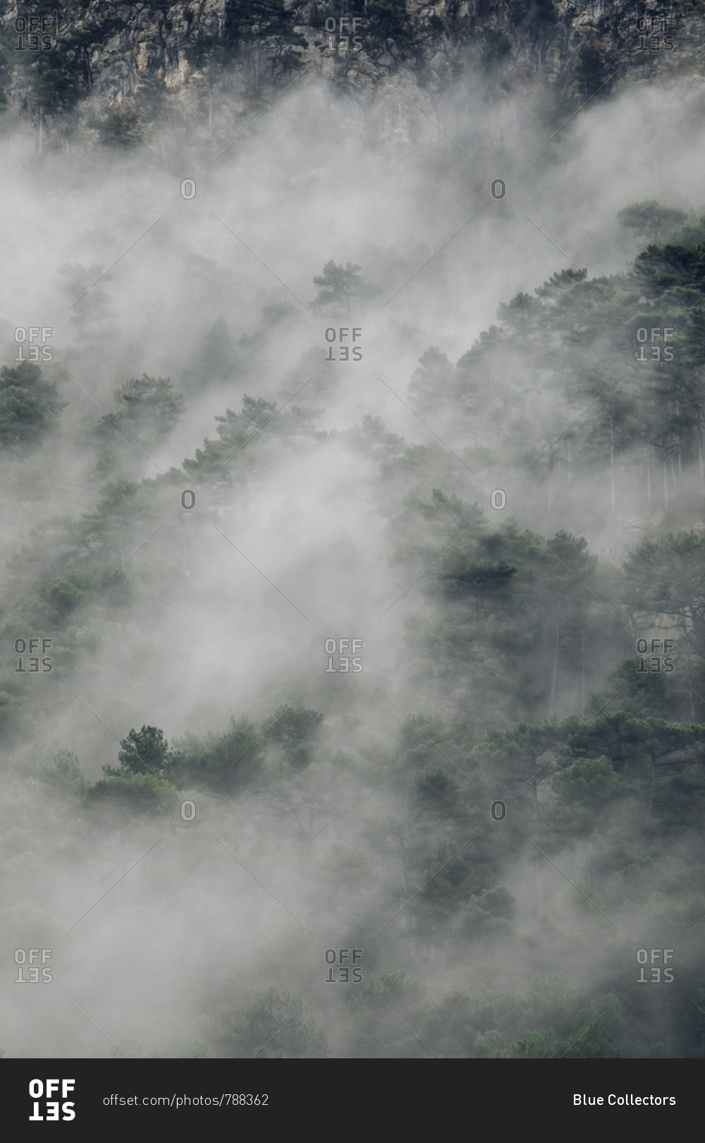 Dense foggy woods in the Pyrenees Mountains, Europe