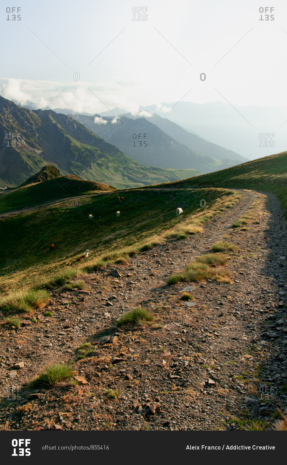 Dirt path extending inland to mossy mountains in foggy mist under cloudy sky