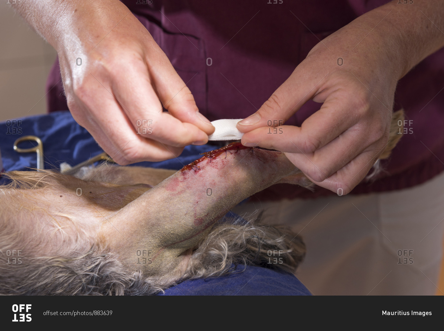 Dog at the veterinarian, operated hind leg, patella, cruciate ligament, sinews, suture, wound care, close-up