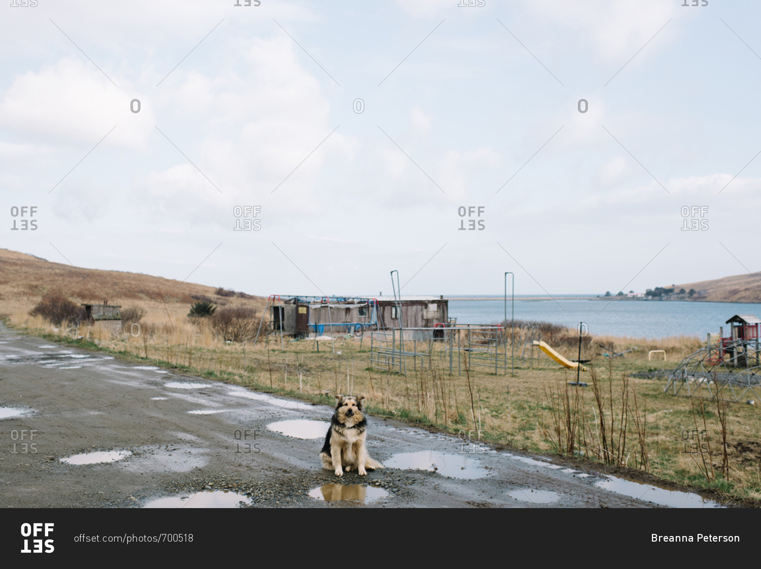 Dog sitting on muddy dirt road in rural Alaska