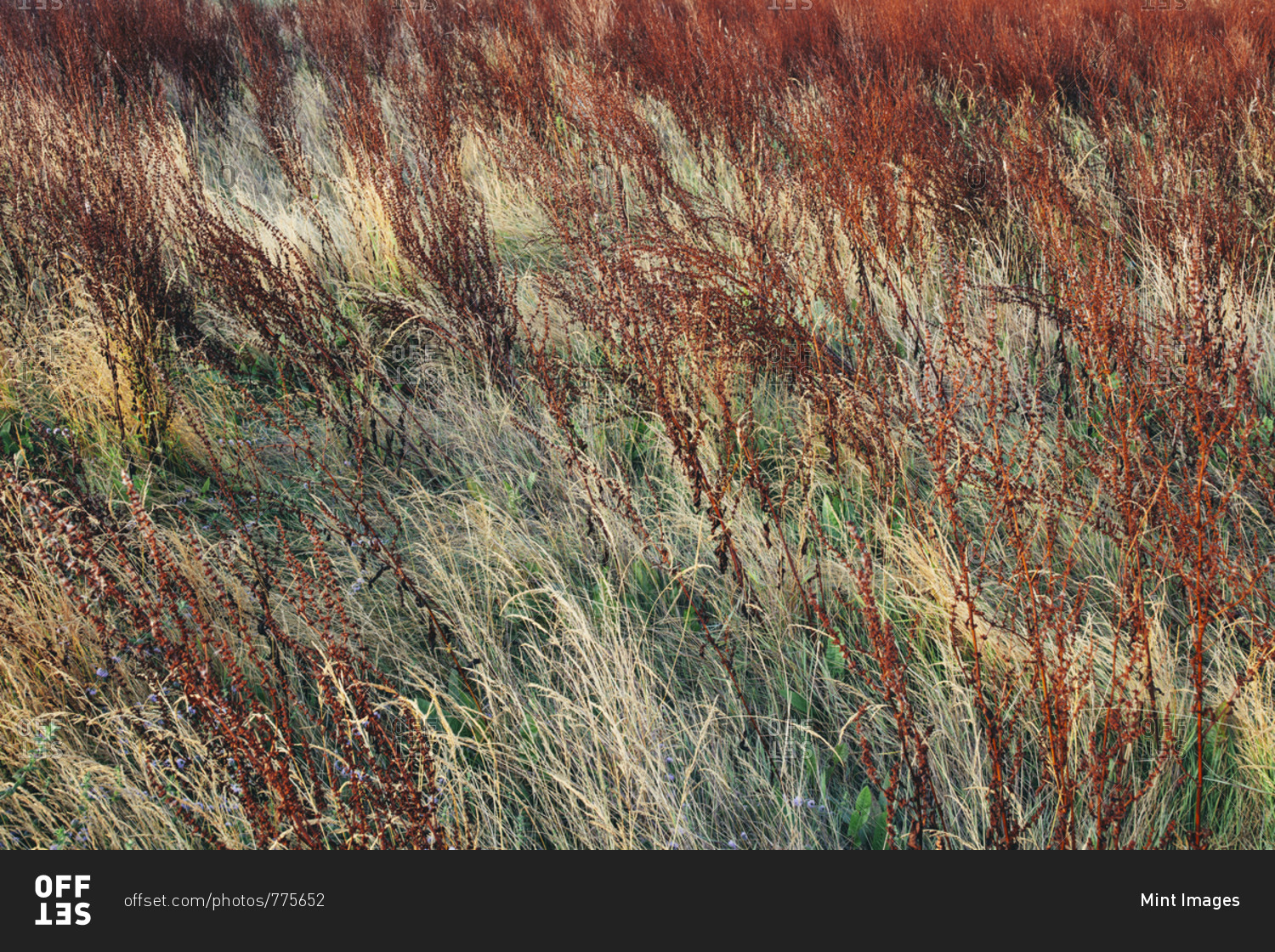 Dry meadow grasses at dawn, Tomales Bay, Point Reyes National Seashore, California, USA.