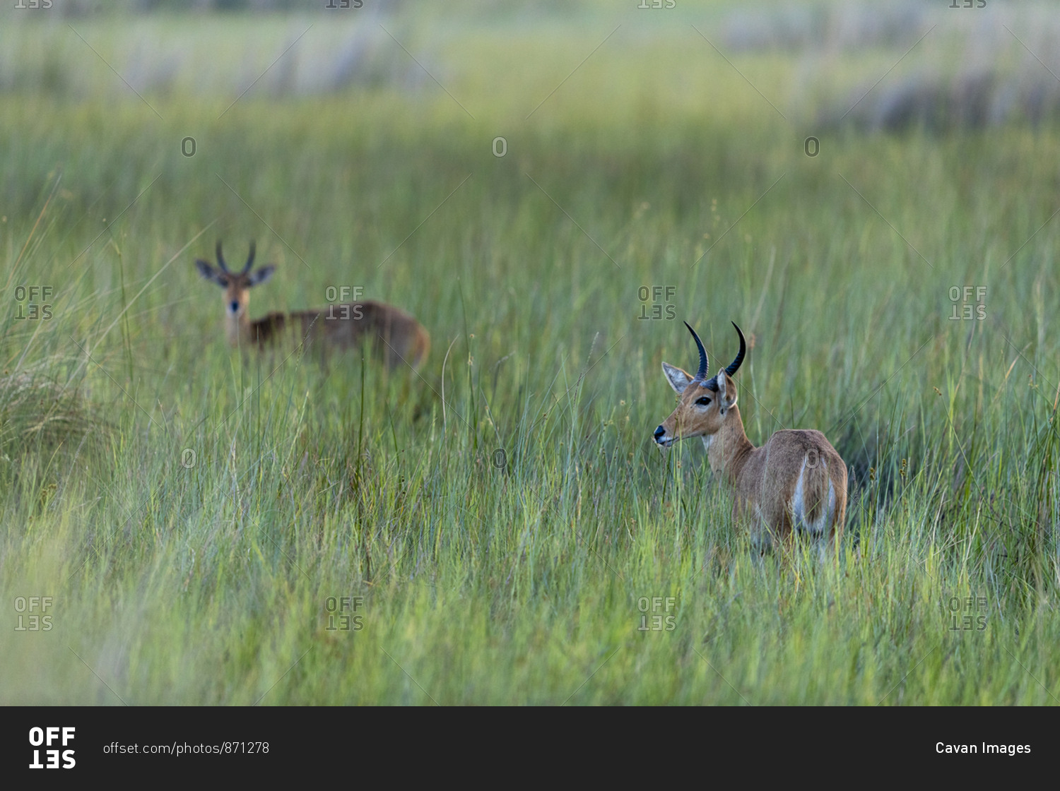 Early morning, two antelopes stand in the middle of tall green grasses