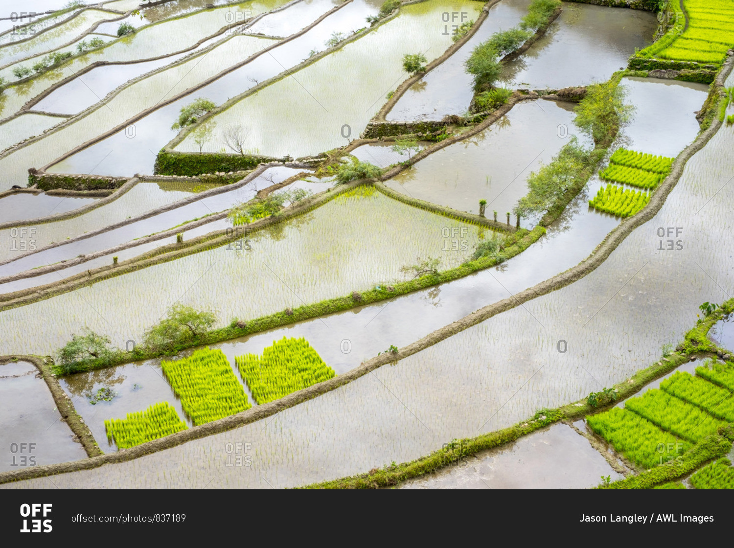 Elevated view of flooded rice terraces during early spring planting season, Batad, Banaue, Mountain Province, Cordillera Administrative Region, Philippines