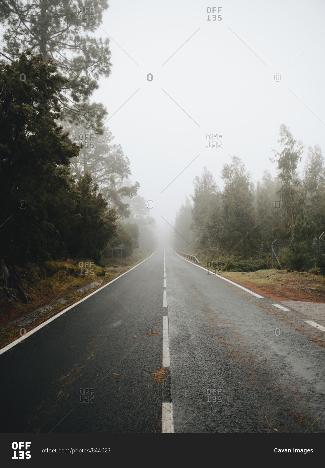 Empty asphalt road through the trees in foggy weather