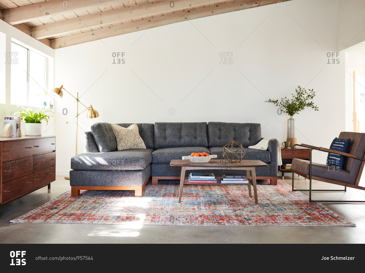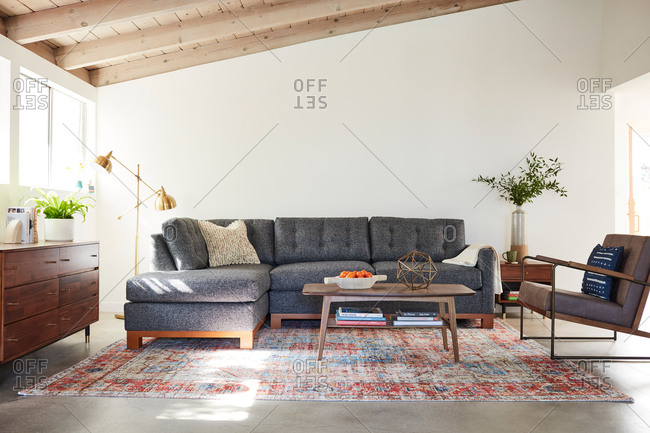 February 12, 2020: Gray sectional sofa in a living room with exposed beam ceilings