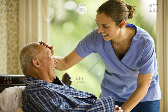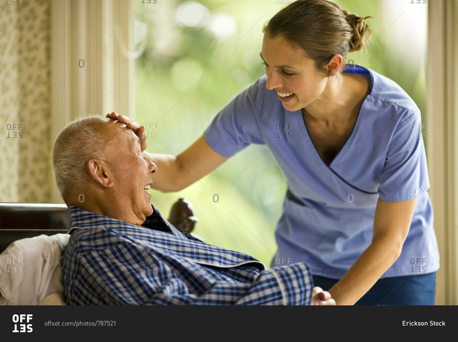 Female nurse leans over to place a hand on the forehead of a senior man lying in a bed.