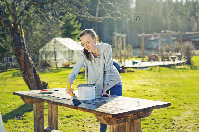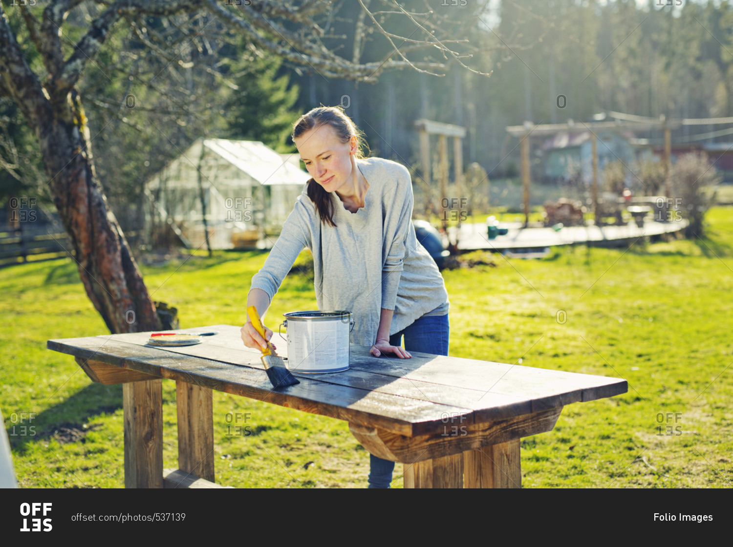 Finland, Paijat-Hame, Heinola, Mid adult woman oiling wooden table in garden