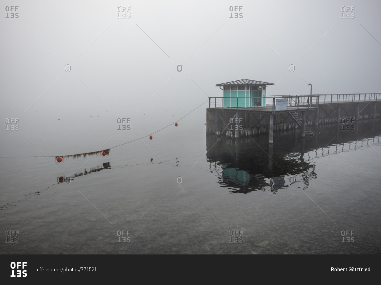 Floats and building at the end of a pier on a foggy day