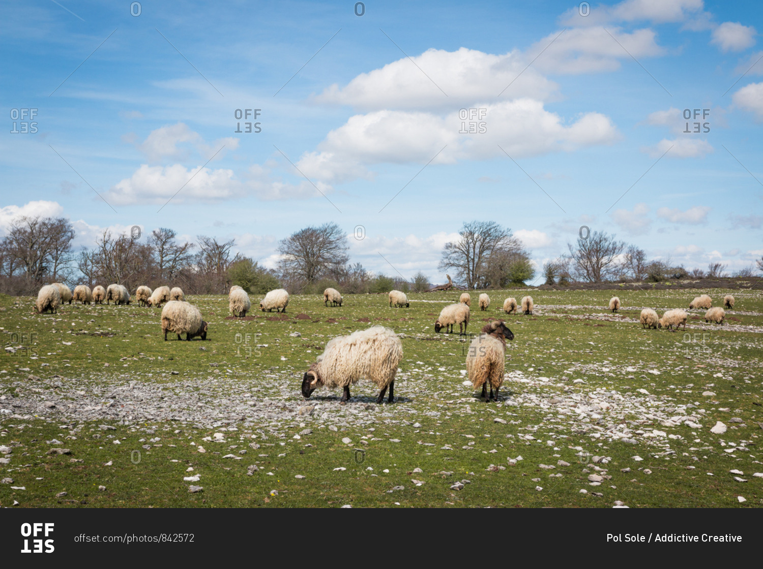 Flock of mountain fluffy sheep grazing and eating grass in green meadow