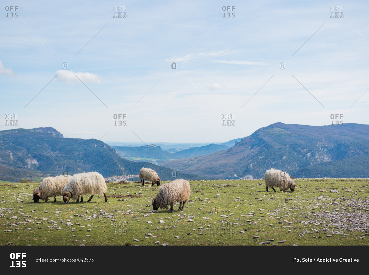 Flock of mountain fluffy sheep grazing and eating grass in green meadow