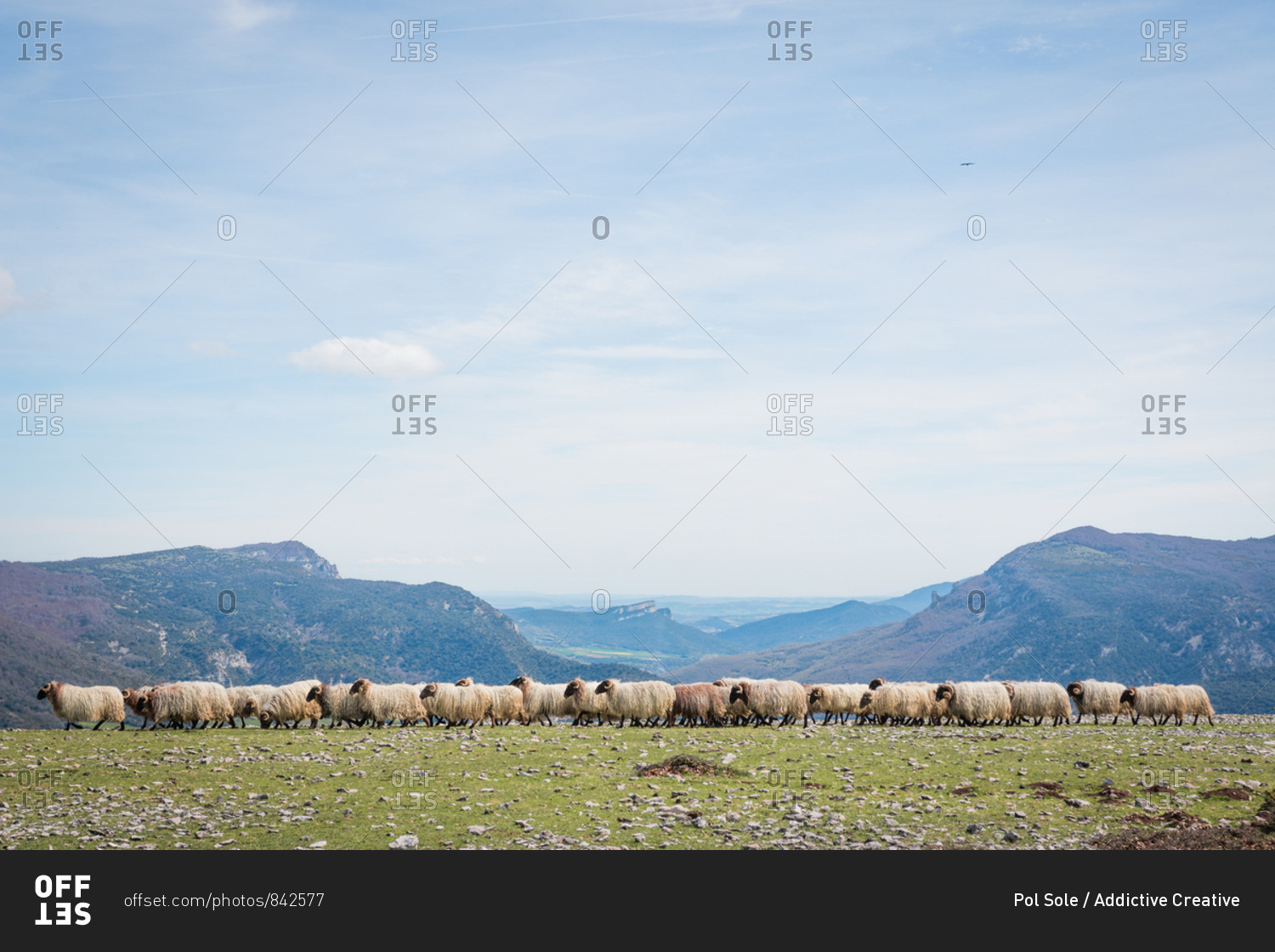 Flock of mountain fluffy sheep grazing and eating grass in green meadow