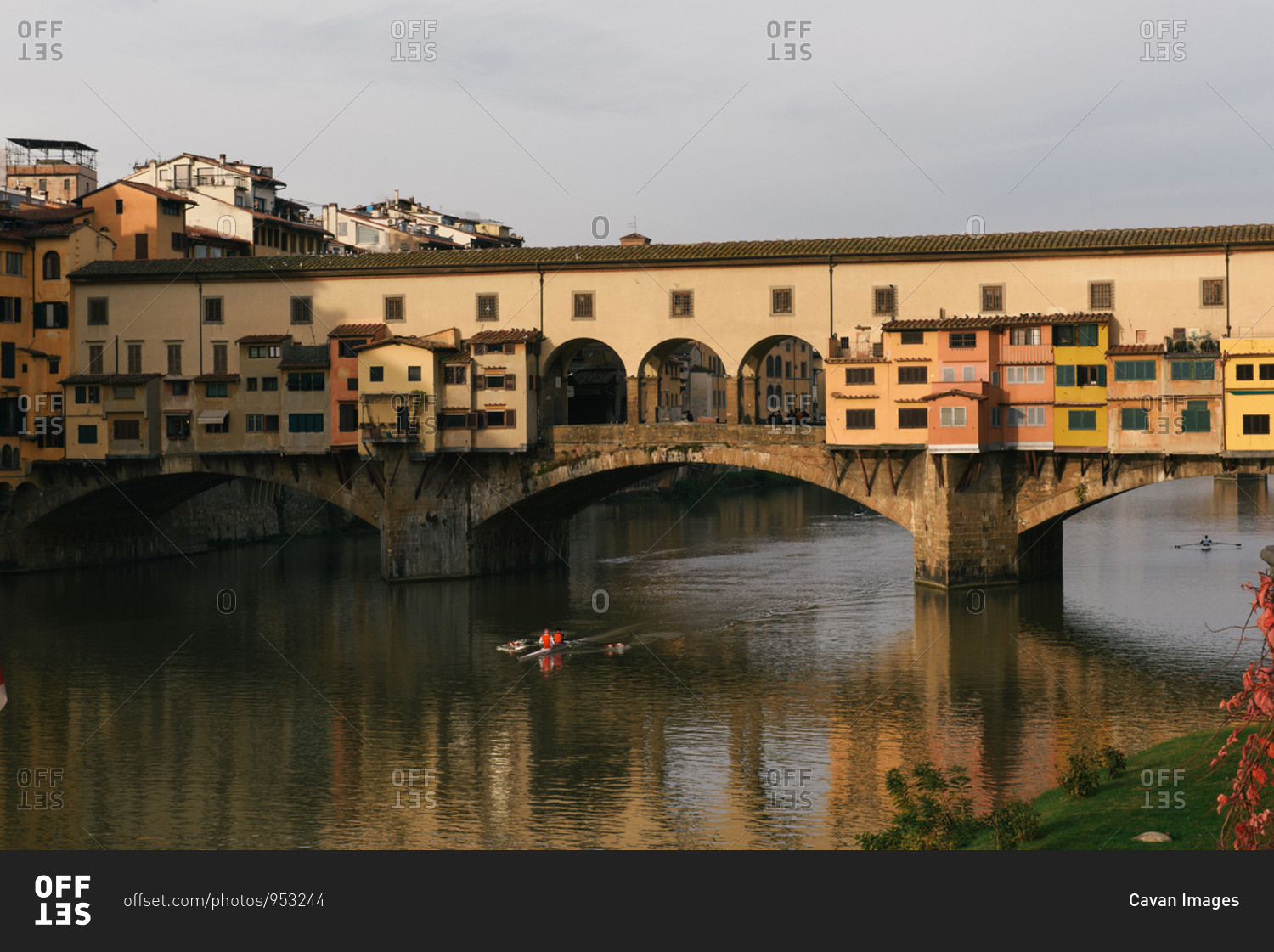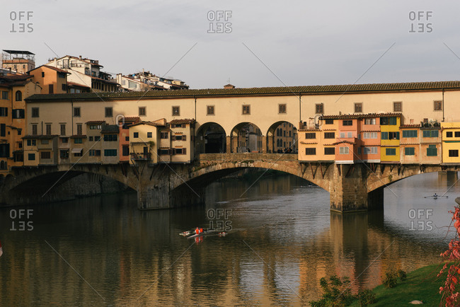 Florence, Tuscany, Italy - November 30, 2018: The Ponte Vecchio as seen from the Uffizi gallery as rowers cross under