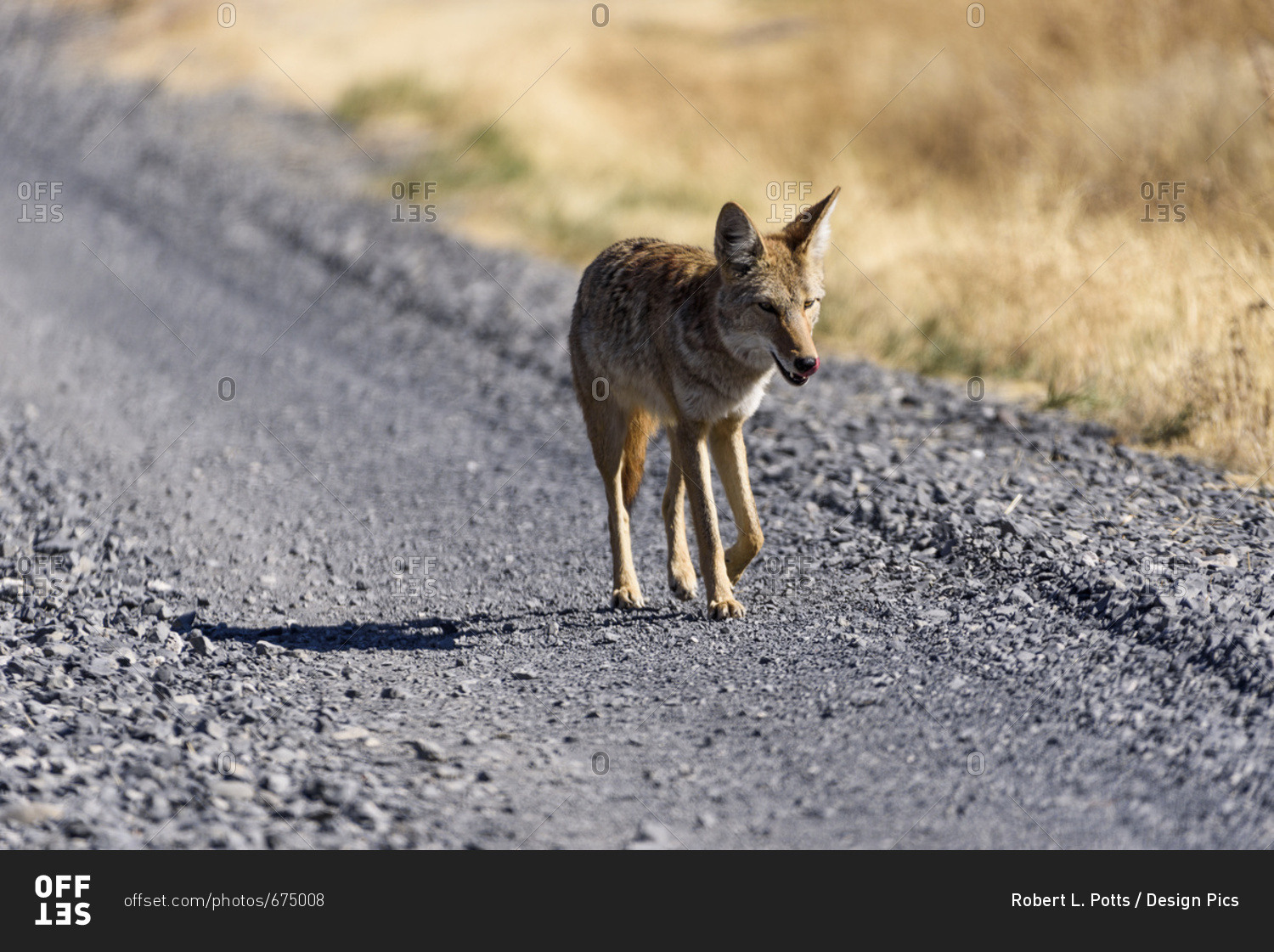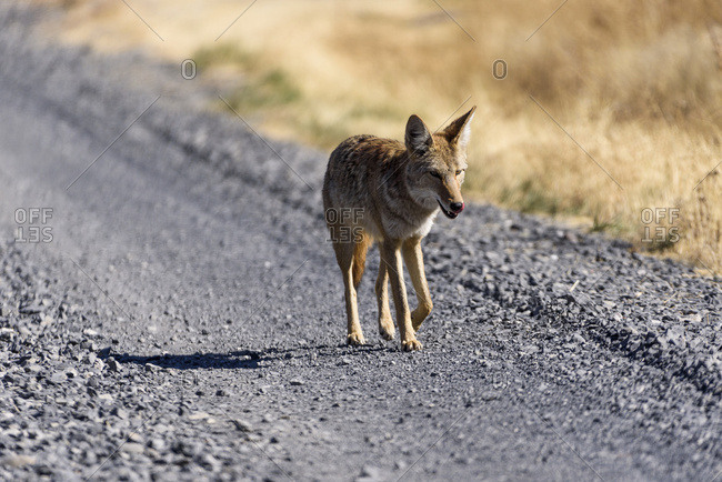Frenchglen, Oregon, United States of America - September 15, 2016: A Coyote (Canis Latrans) Trots Along The Road In Eastern Oregon; Frenchglen, Oregon, United States Of America