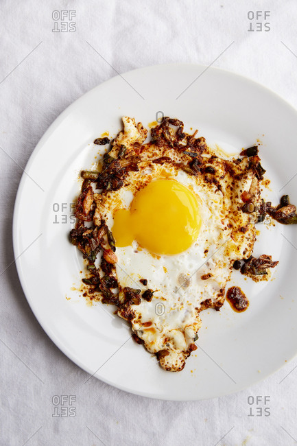 Fried egg in paprika chilli oil in a white plate on a white linen cloth,