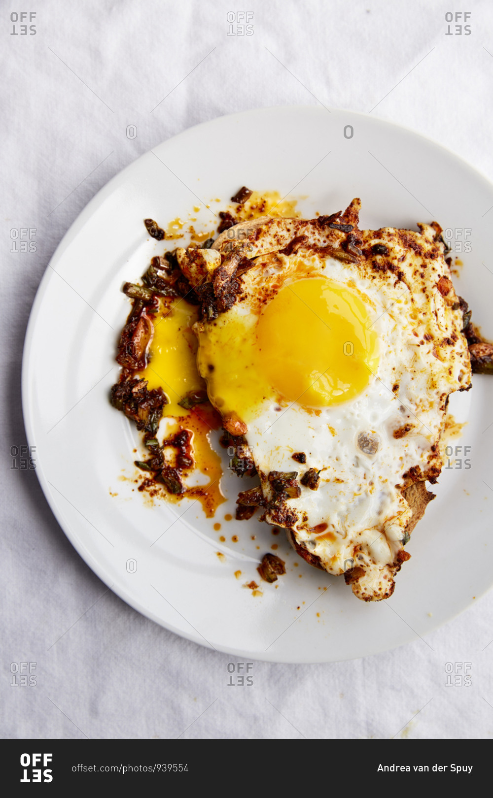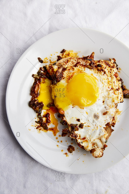 Fried egg on toast with paprika chilli oil in a white plate on a white linen cloth,